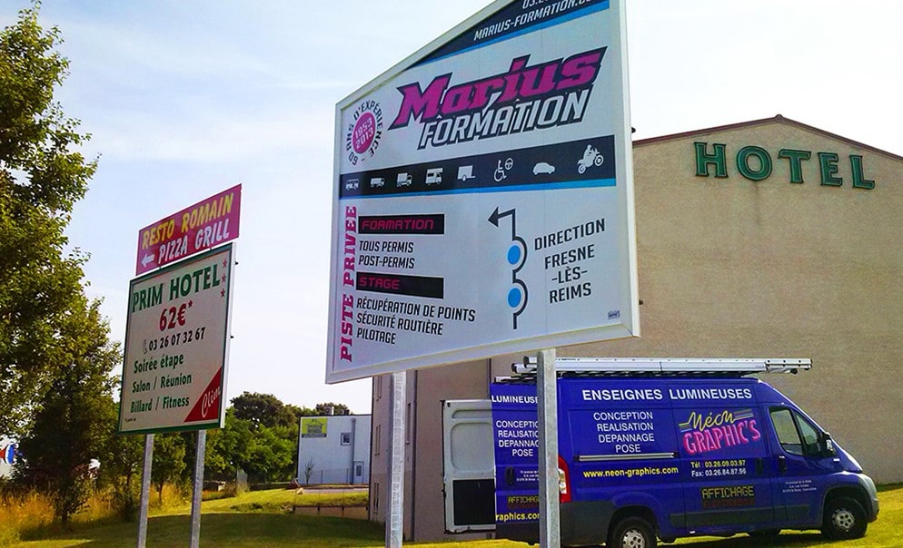 Est qualifiée de pré-enseigne toute publicité permettant de prévenir la proximité d’un lieu ou d’un commerce. Ce panneau signalétique est scellé au sol, peut-être en recto verso et de différentes tailles, à la manière d’un affichage publicitaire classique. Nous fabriquons au sein de notre usine la structure et les visuels apposés sur ce type de signalétique.